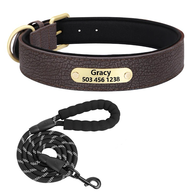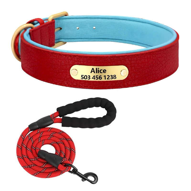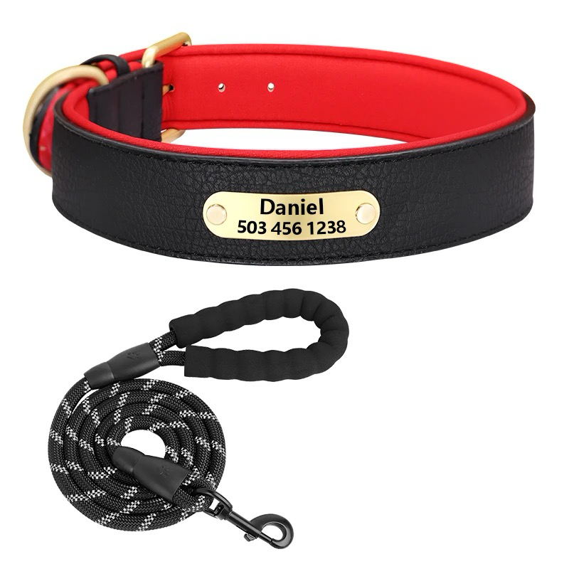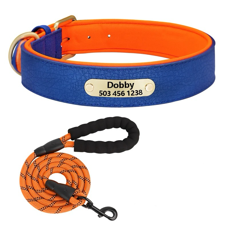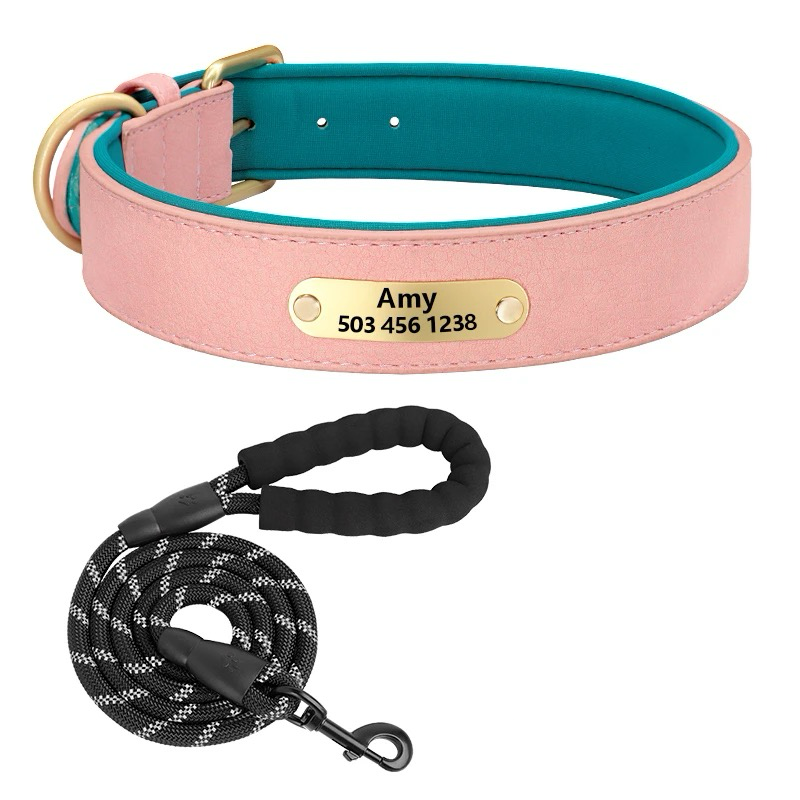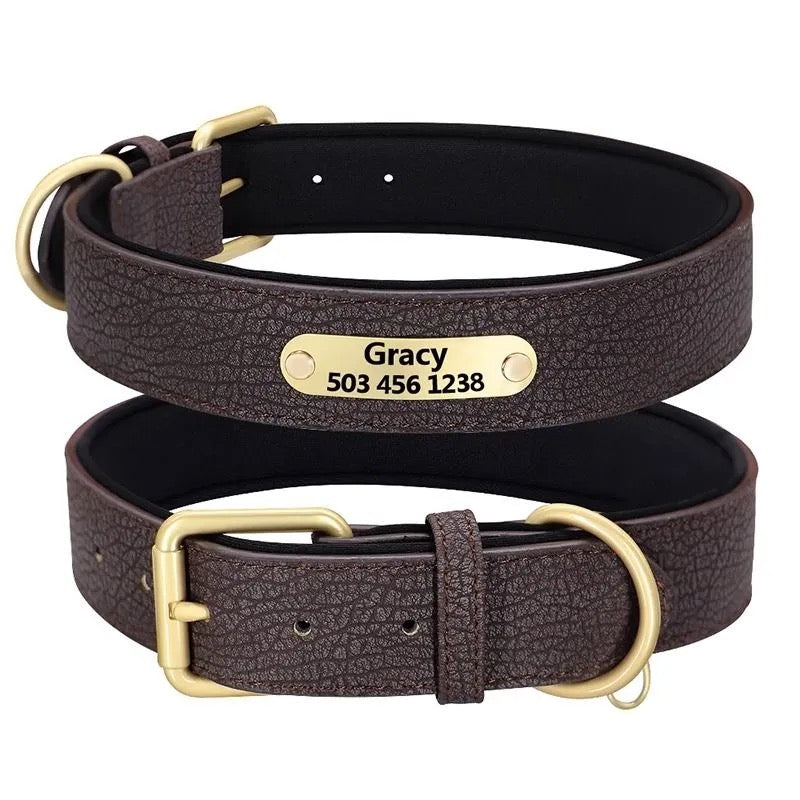 Each collar includes a custom metal ID tag engraved with your dog’s name, your phone number, or any contact details you choose.